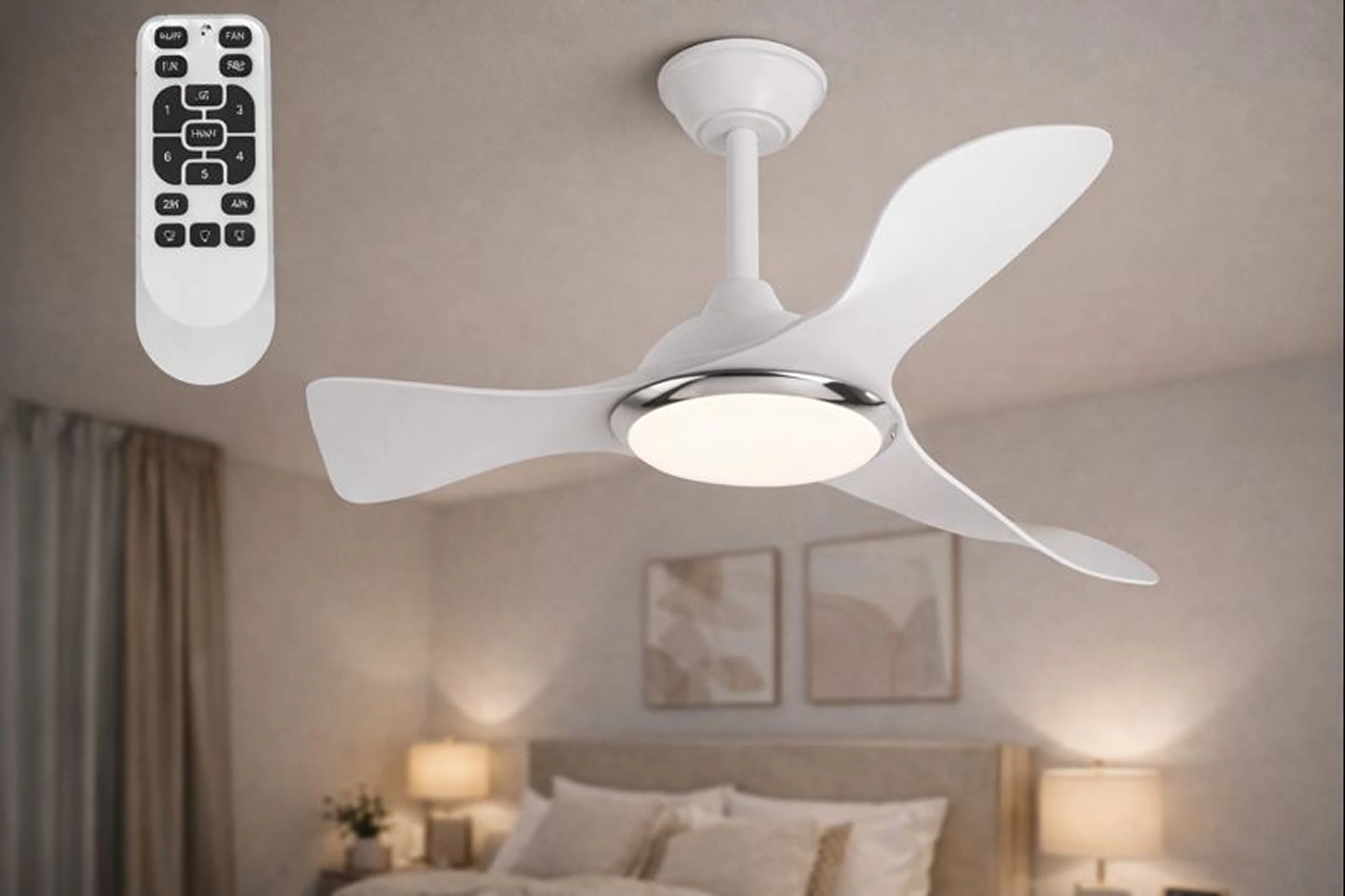 CT-3000 Cenevre LED'li tavan vantilatörü, 132 cm çapında geniş kanatları ve enerji tasarruflu LED aydınlatmasıyla hem modern bir tasarım hem de güçlü bir soğutma sağlar. Uzaktan kumanda ile kolay kontrol edilebilir. 6500K, 4000K ve 3200K renk sıcaklığı seçenekleriyle aydınlatma tercihi sunar.